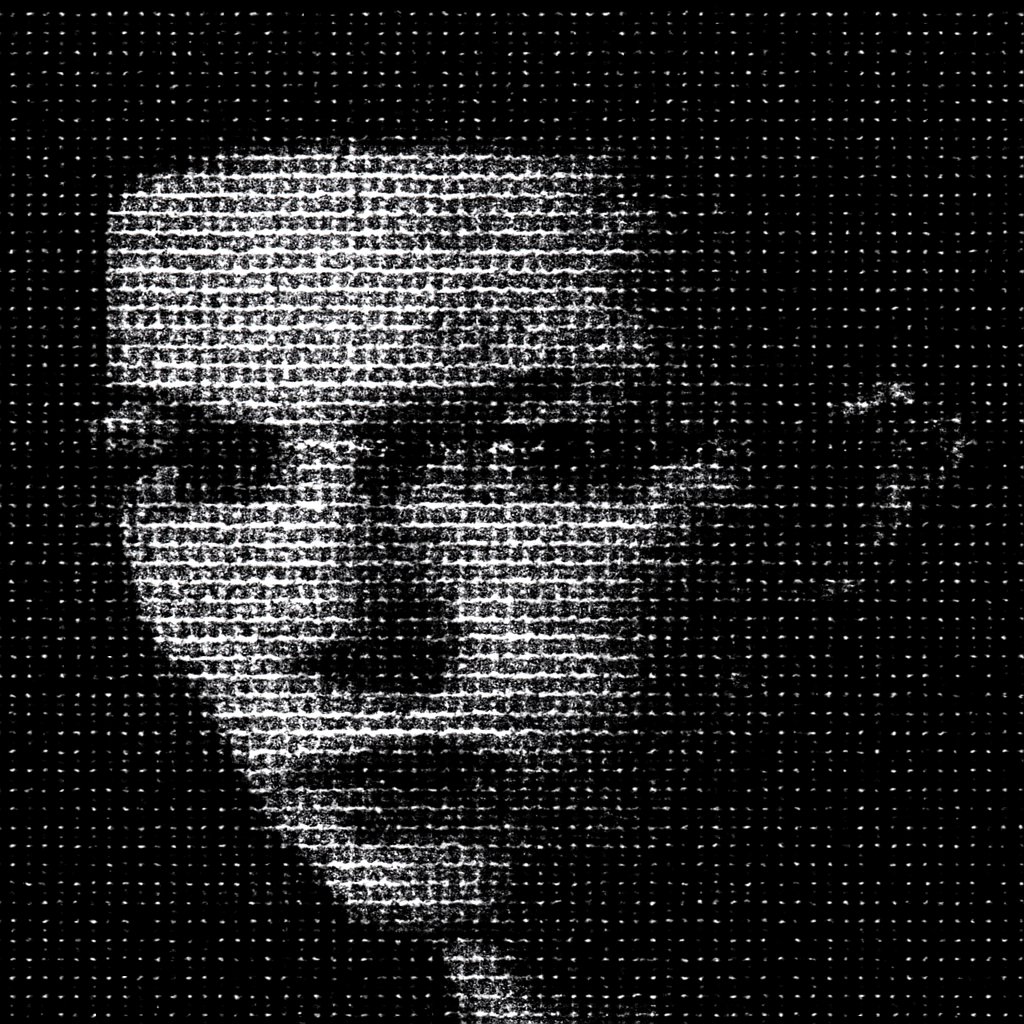 a stylized image of a man with glowing eyes in a dark forest