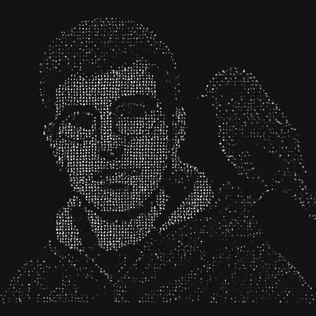 a man wearing glasses standing next to a bird
